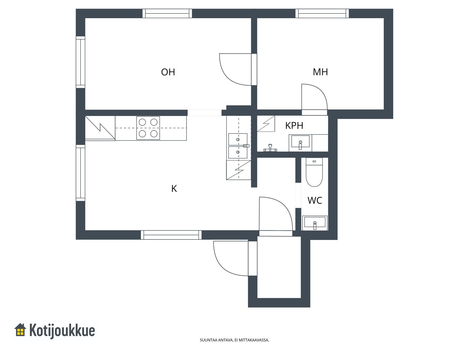 Huoneiston neliöt on käytetty tehokkaasti niin, että kaikille tarpeellisille toiminnoille on hyvin tilaa. Keittiön yhteydessä oleva ruokailutila ja makuuhuoneissa on runsaasti tilaa mahdollistaen erilaiset sisustusratkaisut. Läpitalon päätyasunnon kolmeen suuntaan avautuvat ikkunat tuovat asuntoon runsaasti luonnonvaloa.