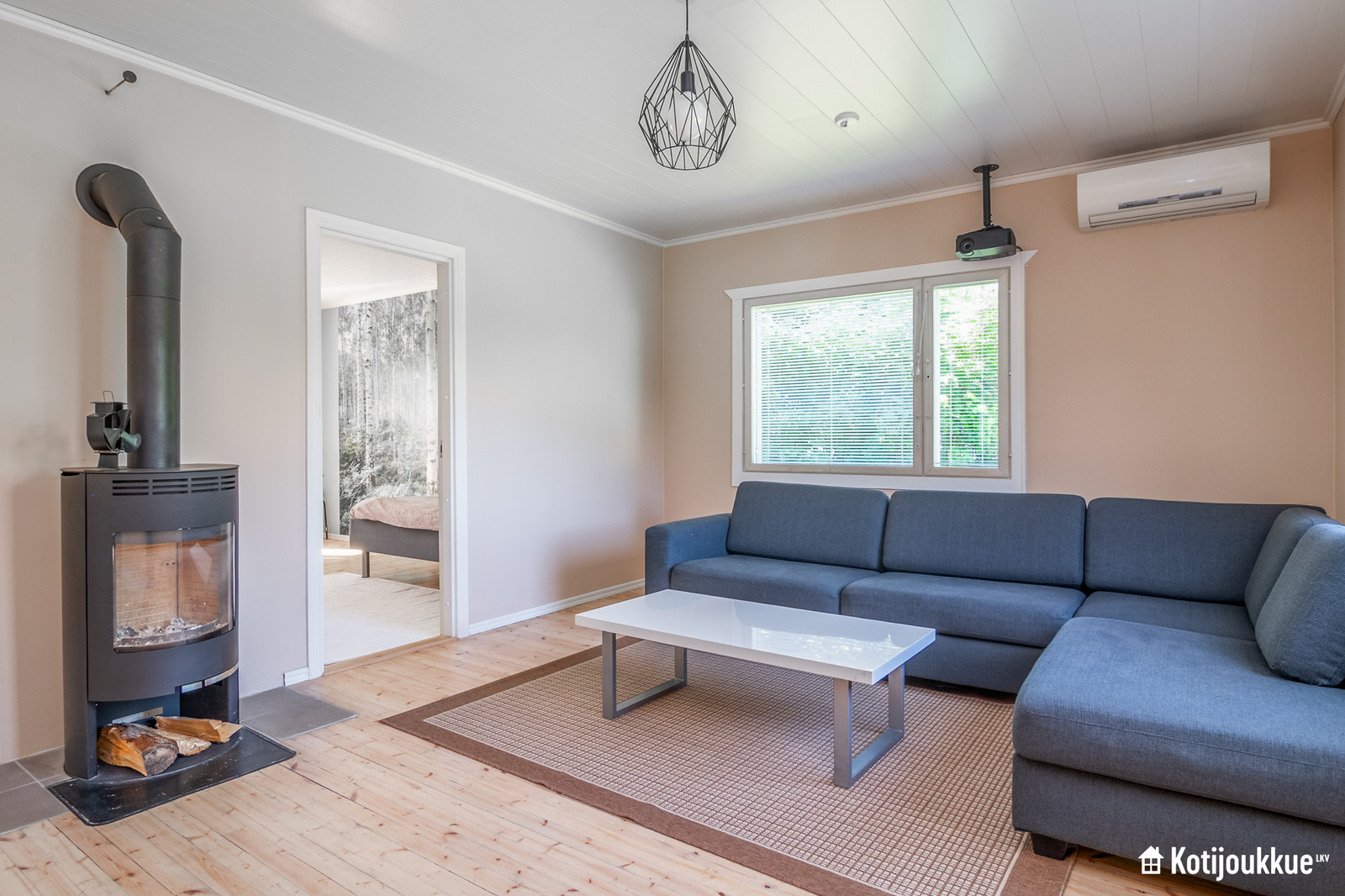 Det funktionella köket har gott om skåp och plats för matbord. Vardagsrummet erbjuder en mysig plats för familjens gemensamma stunder, och på samma våning finns även ett av husets sovrum.