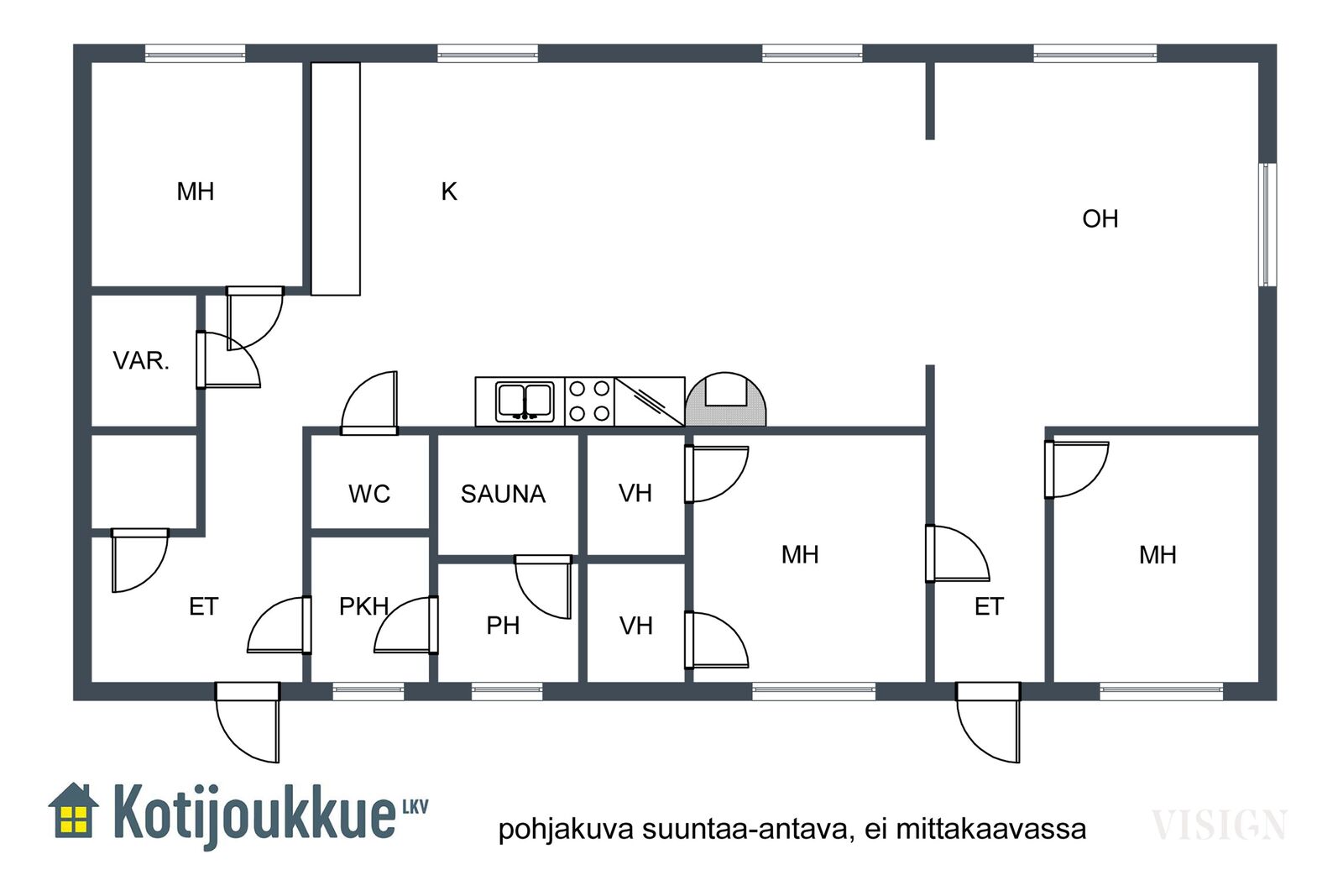 iso olohuone, keittiö, pesuhuone, sauna, wc,