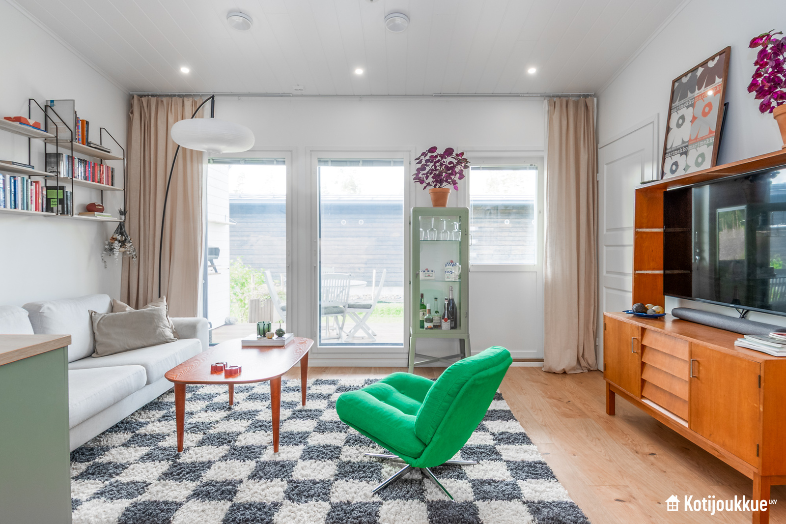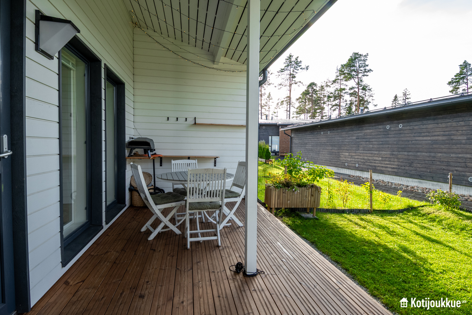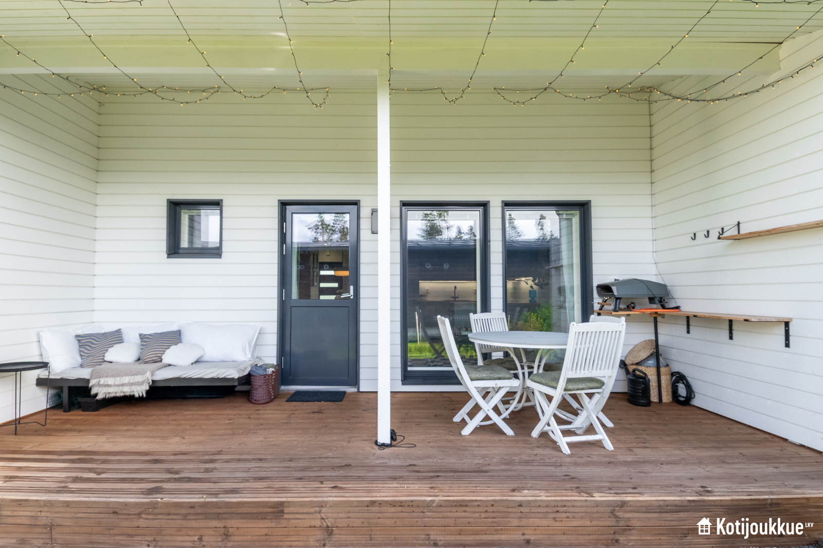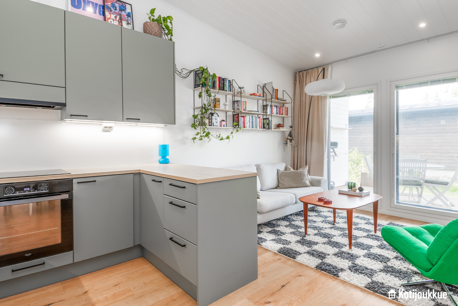 Keittiö ja olohuone muodostavat upean avaran tilan, jossa sujuu niin ruoanlaitto, ruokailu kuin loikoilukin. Korotettu katto ja suuret ikkunat tuovat luonnonvaloa läpi, tehden tilasta todella valoisan. Tilan avaruutta ja yhtenäisyyttä korostaa huoneissa käytetty kaunis vinyylilattia. Olohuoneesta on käynti katetulle länsiterassille, jossa tilaa nauttia kauniista kesäpäivistä,