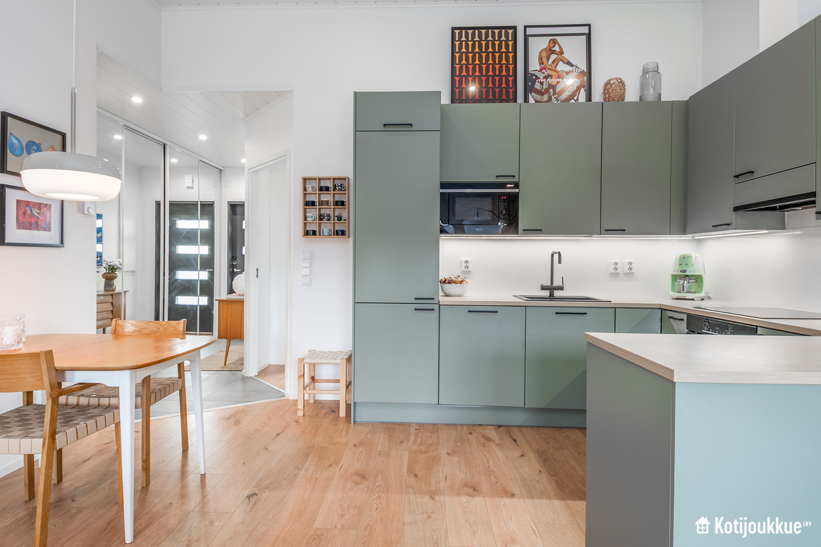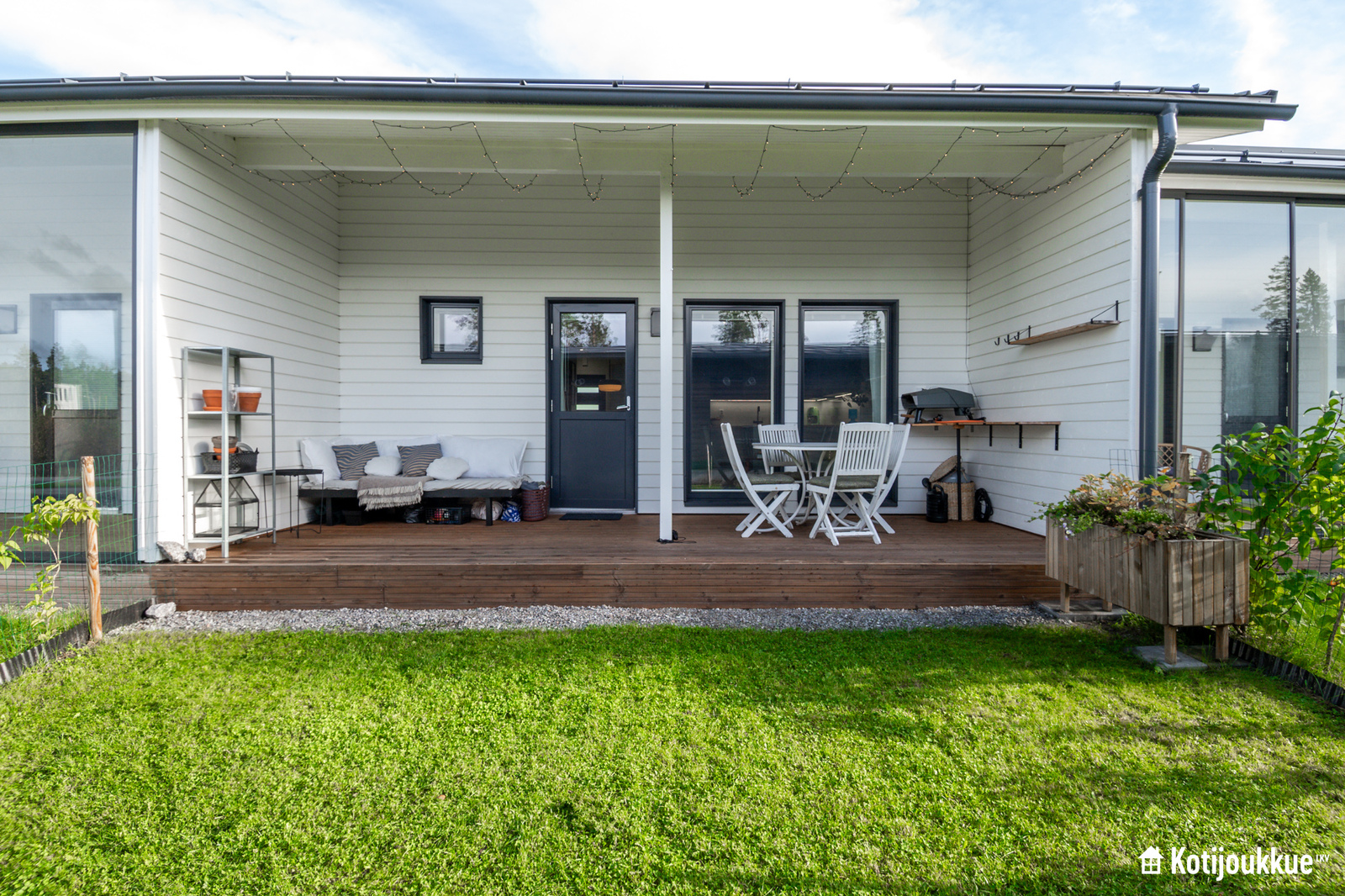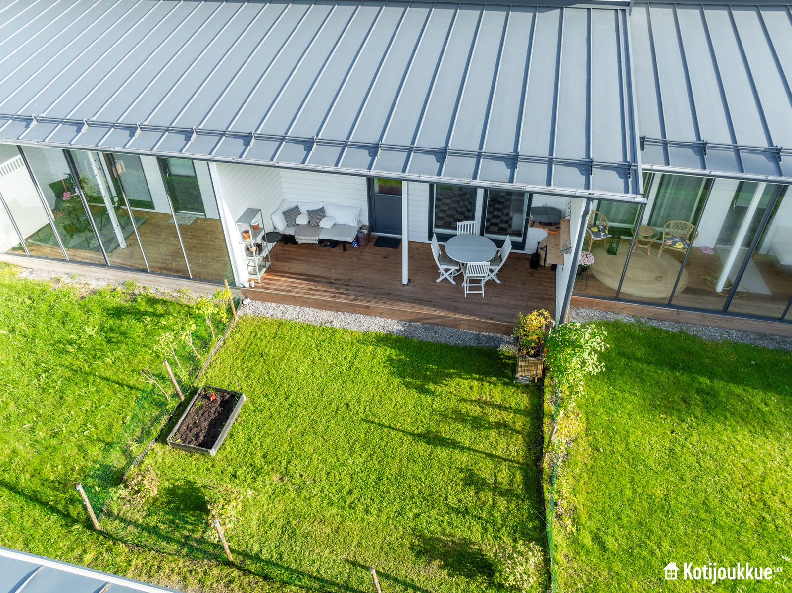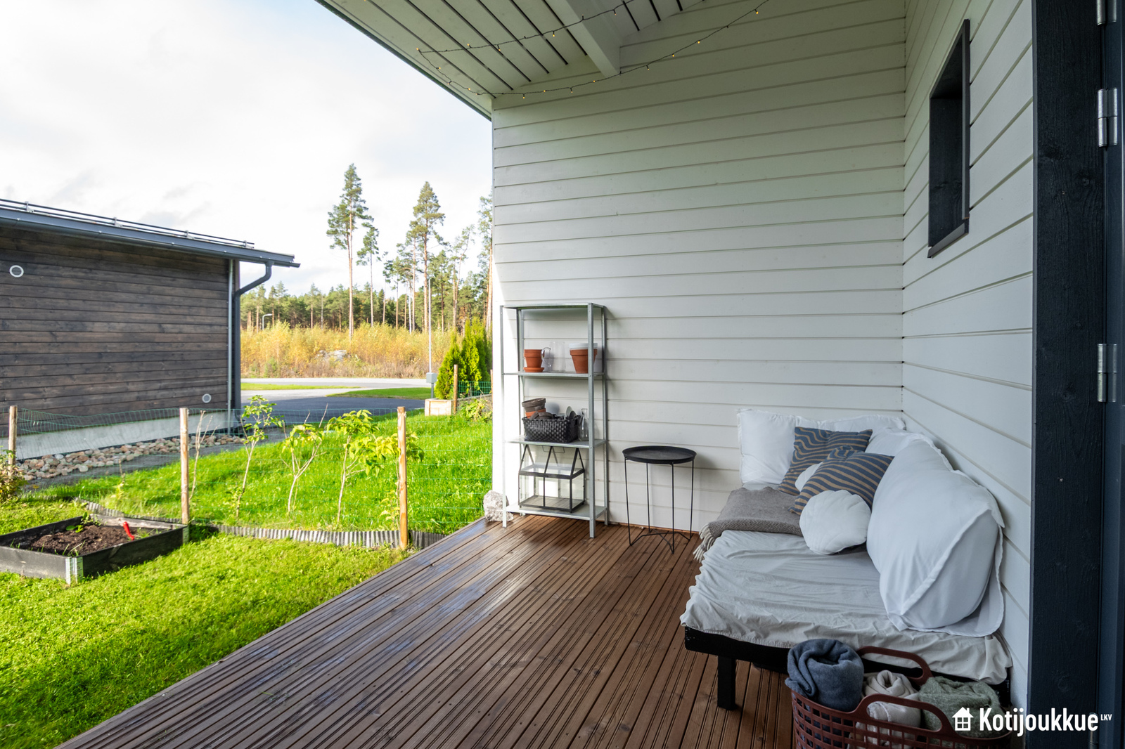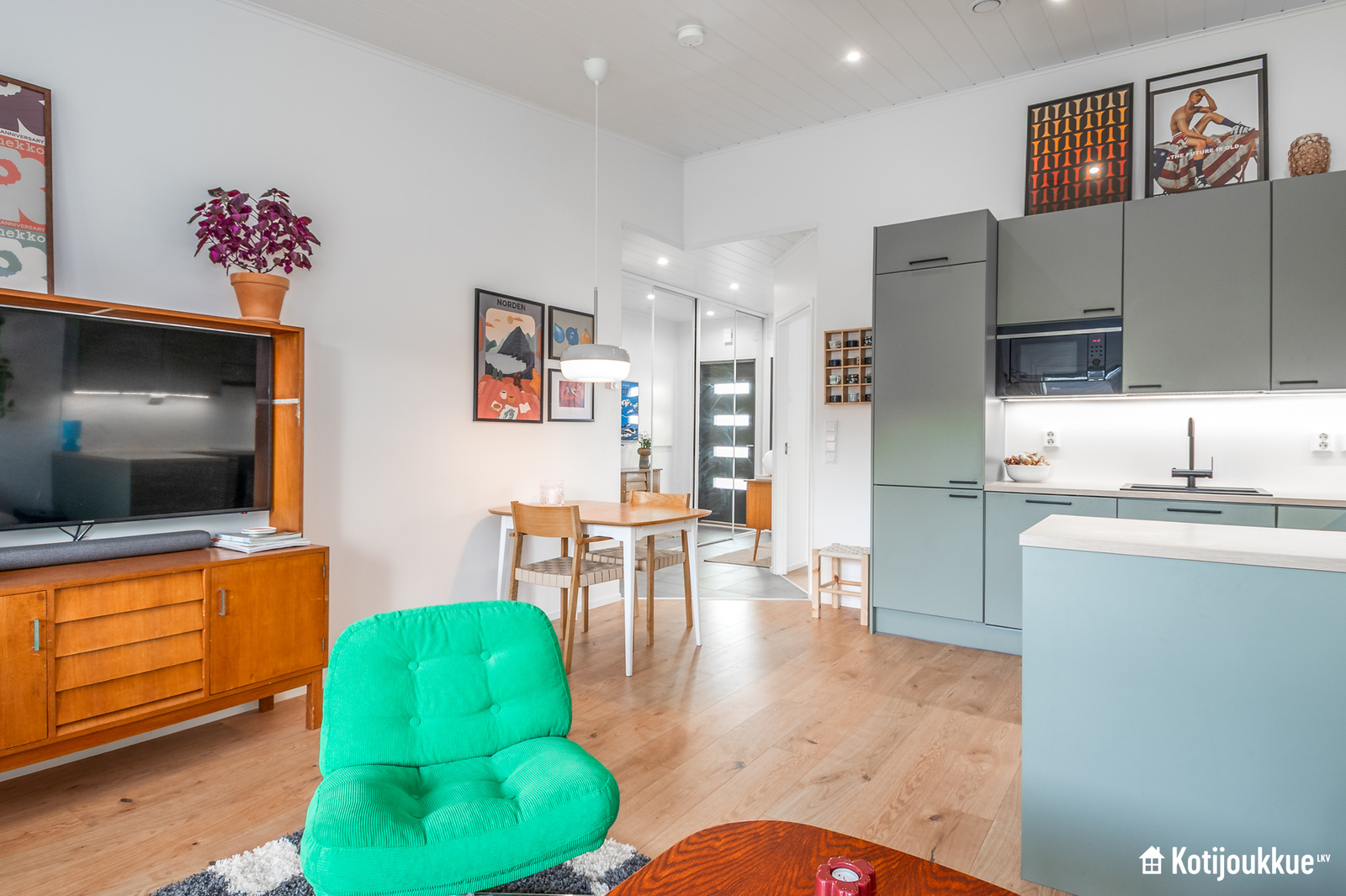 Keittiö ja olohuone muodostavat upean avaran tilan, jossa sujuu niin ruoanlaitto, ruokailu kuin loikoilukin. Korotettu katto ja suuret ikkunat tuovat luonnonvaloa läpi, tehden tilasta todella valoisan. Tilan avaruutta ja yhtenäisyyttä korostaa huoneissa käytetty kaunis vinyylilattia. Olohuoneesta on käynti katetulle länsiterassille, jossa tilaa nauttia kauniista kesäpäivistä,