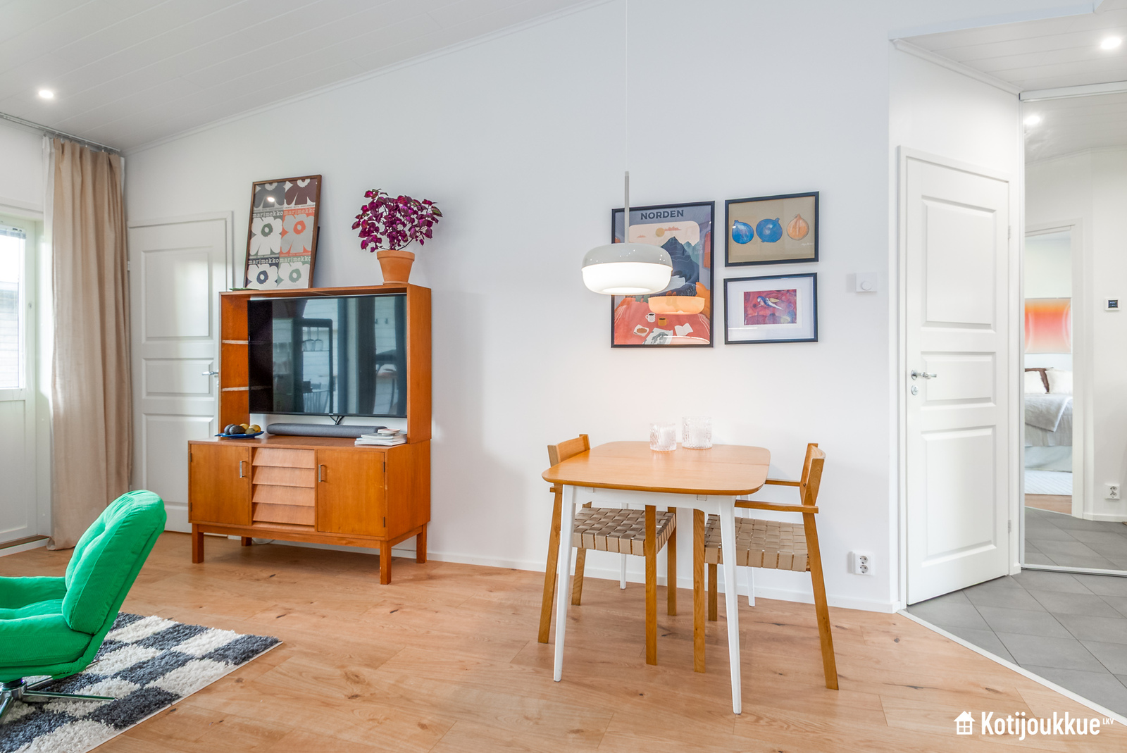 Olohuoneeseen mahtuu hyvin ruokapöytä
