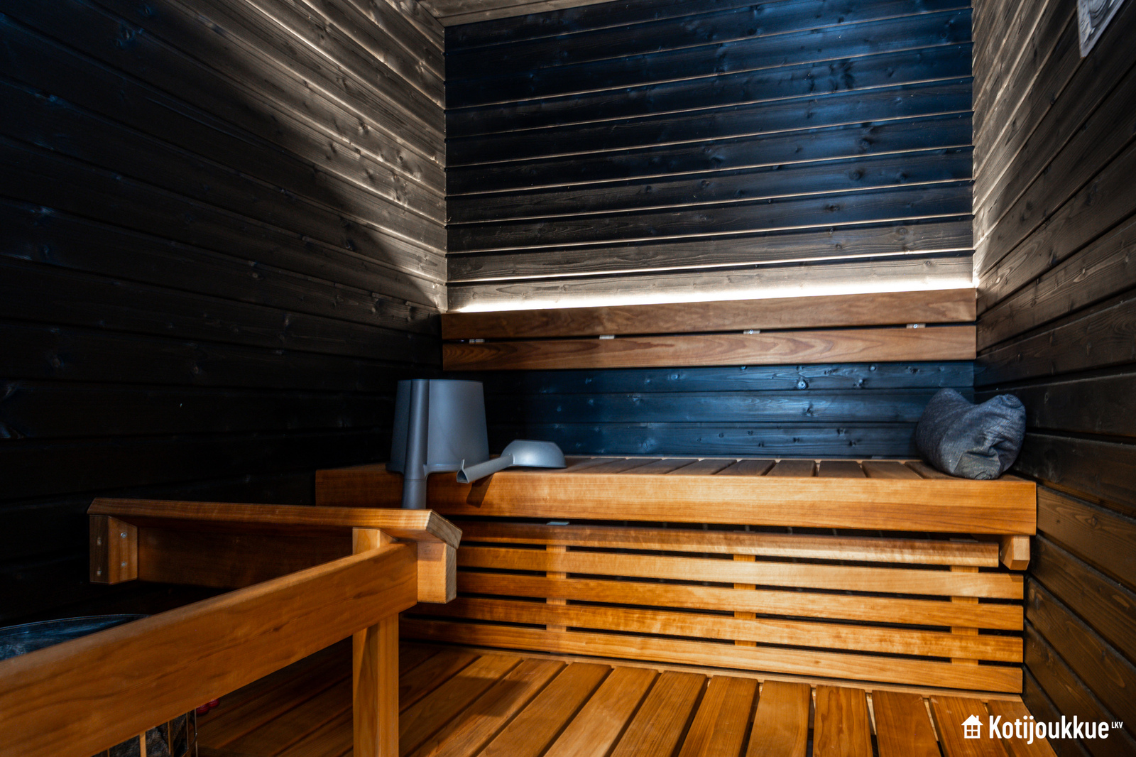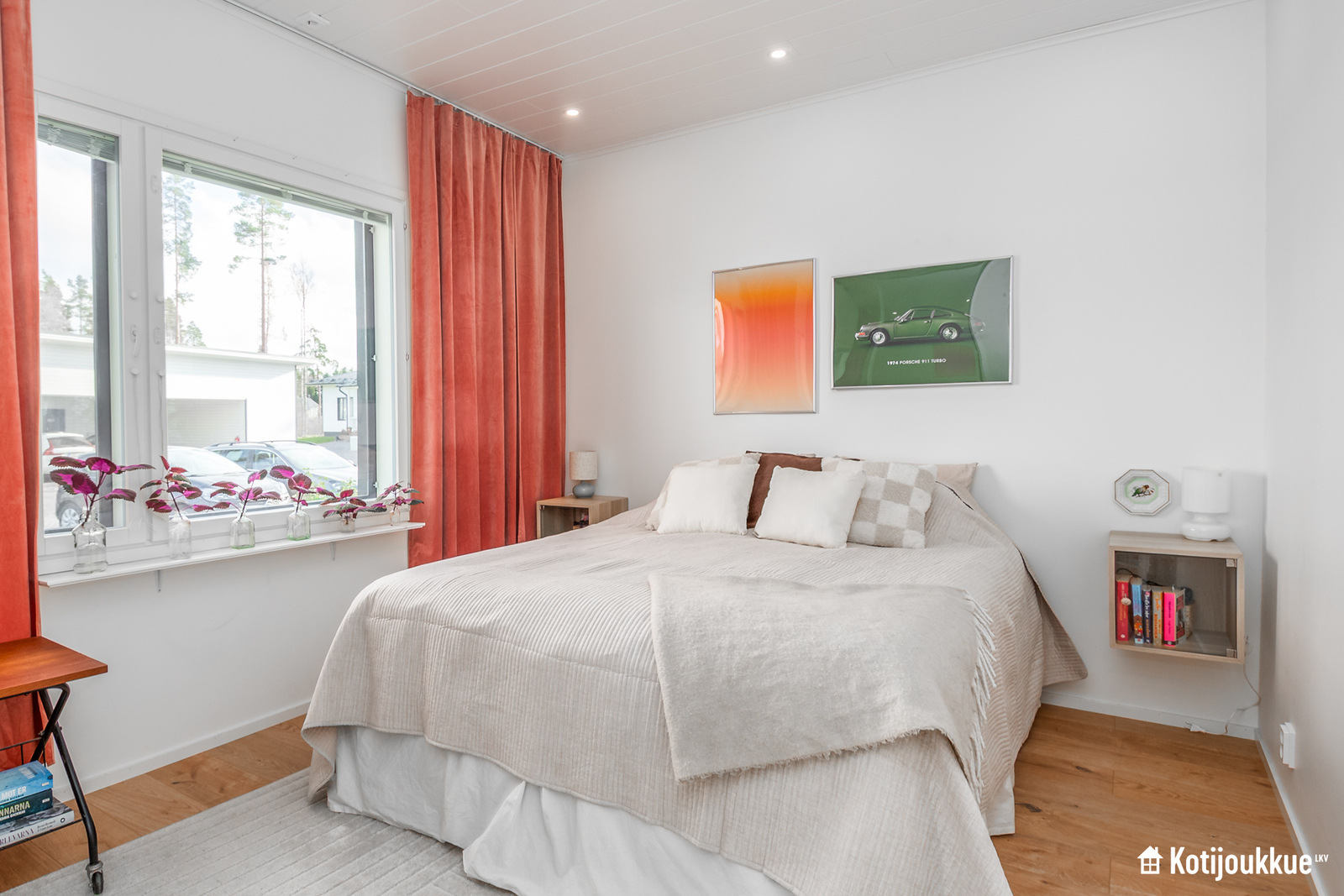 Ilmava linja jatkuu myös makuuhuoneessa, joka mahdollistaa myös työpisteen sijoittelun. Myös säilytystilan riittävyydestä on huolehdittu tilavilla kaapistoilla niin eteisessä kuin makuuhuoneessakin. Asunnon tyyli jatkuu saumattomasti kylpyhuone- ja saunatiloihin, jonka upea sauna tarjoaa pehmeät löylyt ja kylpyhuoneen yhteydessä on erillinen tila pyykkihuollolle.