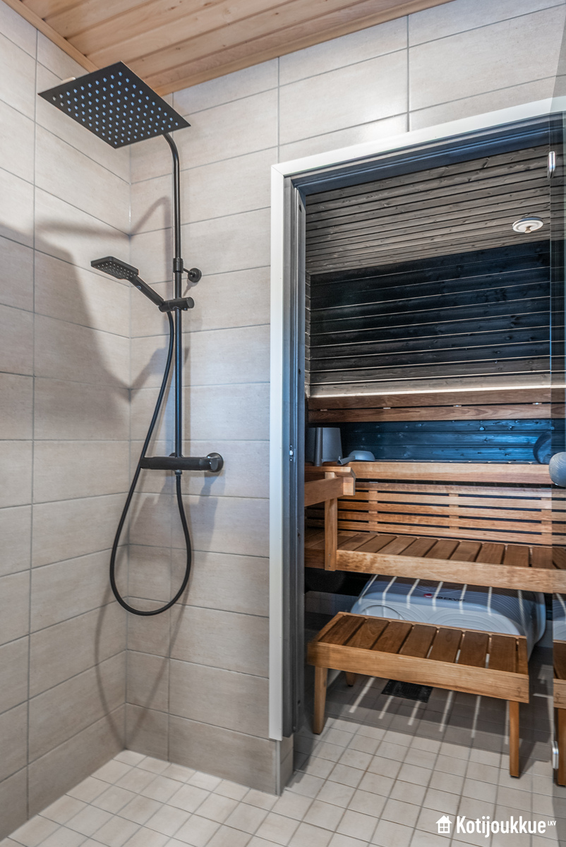 suihkuseinä, pesukoneliitäntä, lattialämmitys, suihku, kiinteät valaisimet, kylpyhuonekaapisto