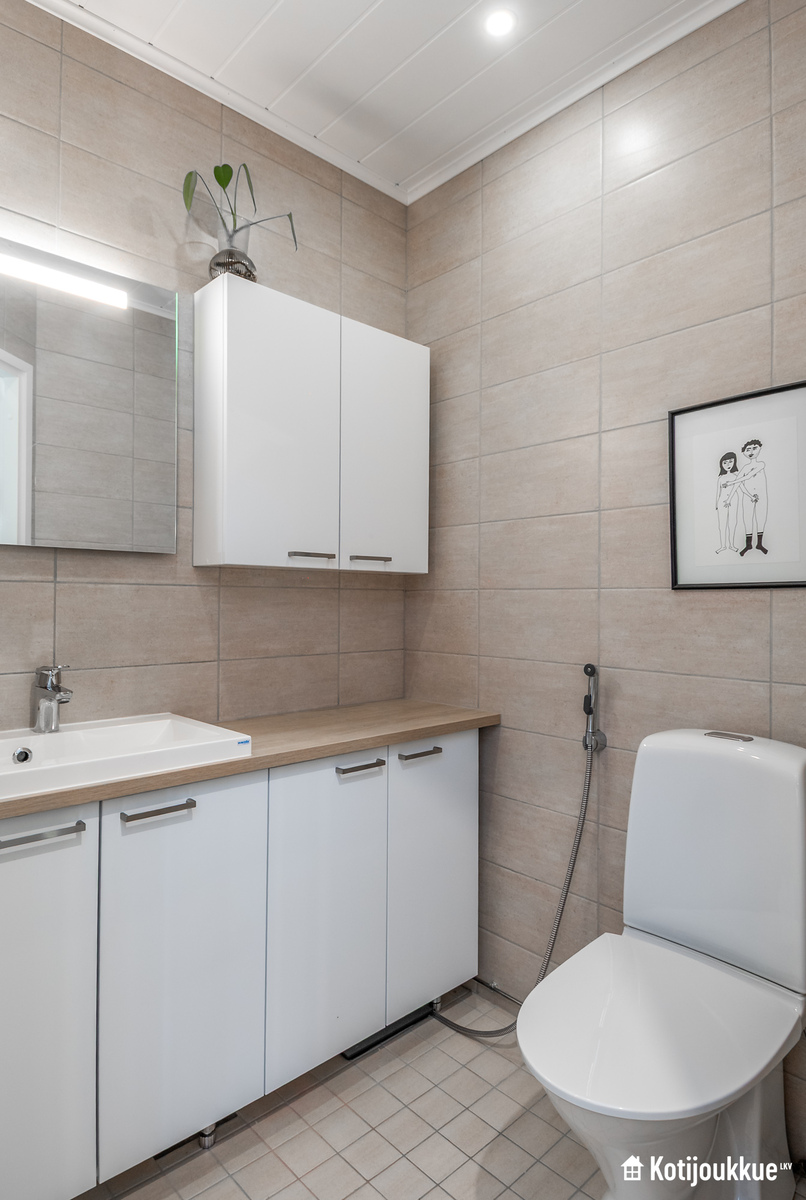Hyväkuntoinen kylpyhuone lattialämmityksellä.