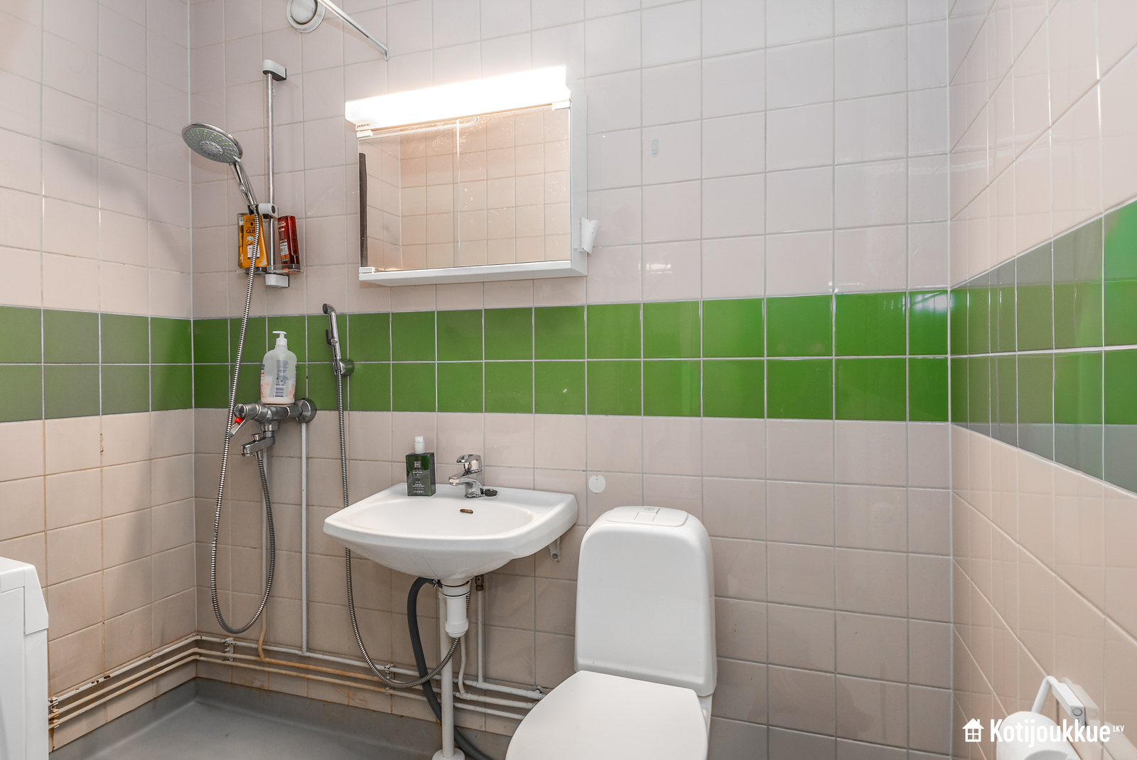 pesukoneliitäntä, wc-istuin, suihku, peilikaappi, kiinteät valaisimet