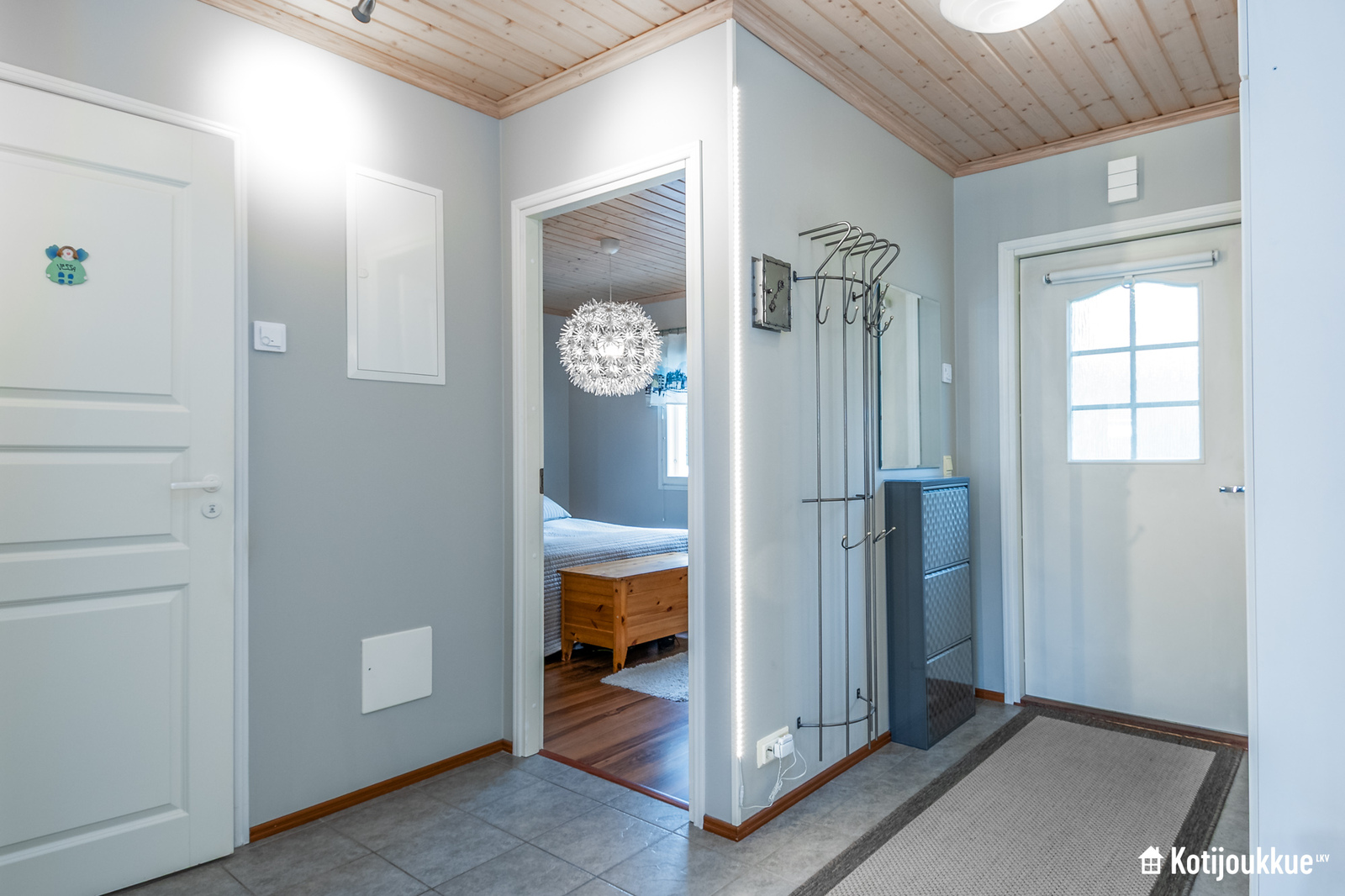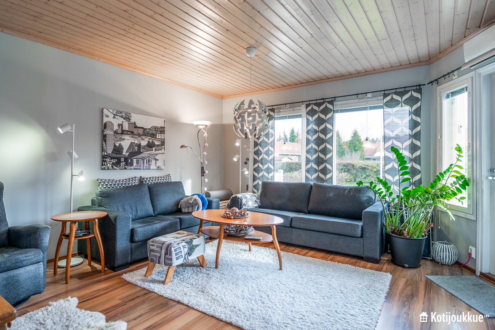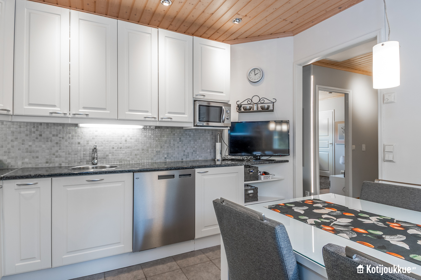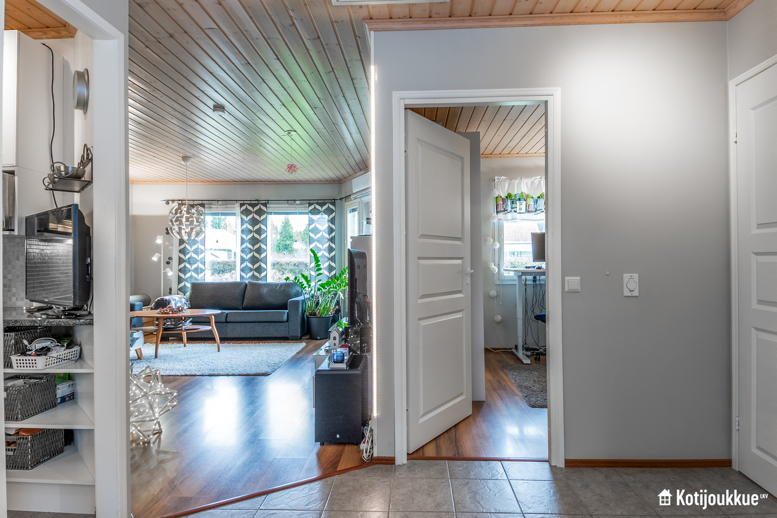 Koti on harmoninen ja kaunis kokonaisuus, jonka selkeä pohjaratkaistu antaa avaimet toimivaan arkeen. Heti sisäänkäynnin yhteydessä on avara keittiö, jossa runsaasti säilytystilaa ja tilaa ruokapöydälle. Tilava olohuone antaa sisustajalle paljon vaihtoehtoja sekä on kuin luotu perheen yhteiseen ajanviettoon. Olohuoneesta on myös kulku takapihan terassille, joka jatkaakin oleskelutiloja luontevasti kesäkaudella. Paritalomuodostelman ansiosta takapiha jatkuu talon päädylle saakka ja tilaa riittää, vaikka pienelle hyötypuutarhalle.
