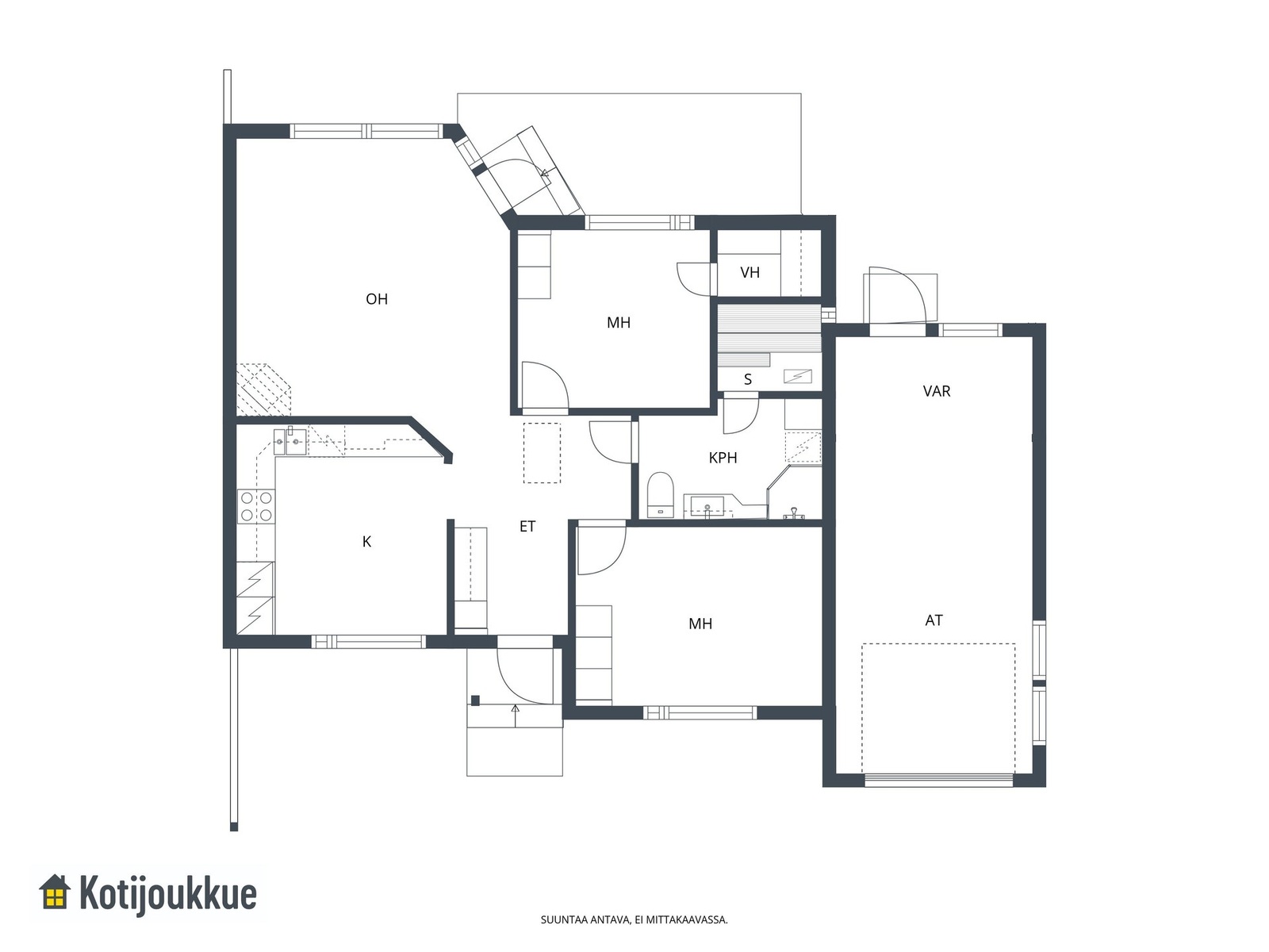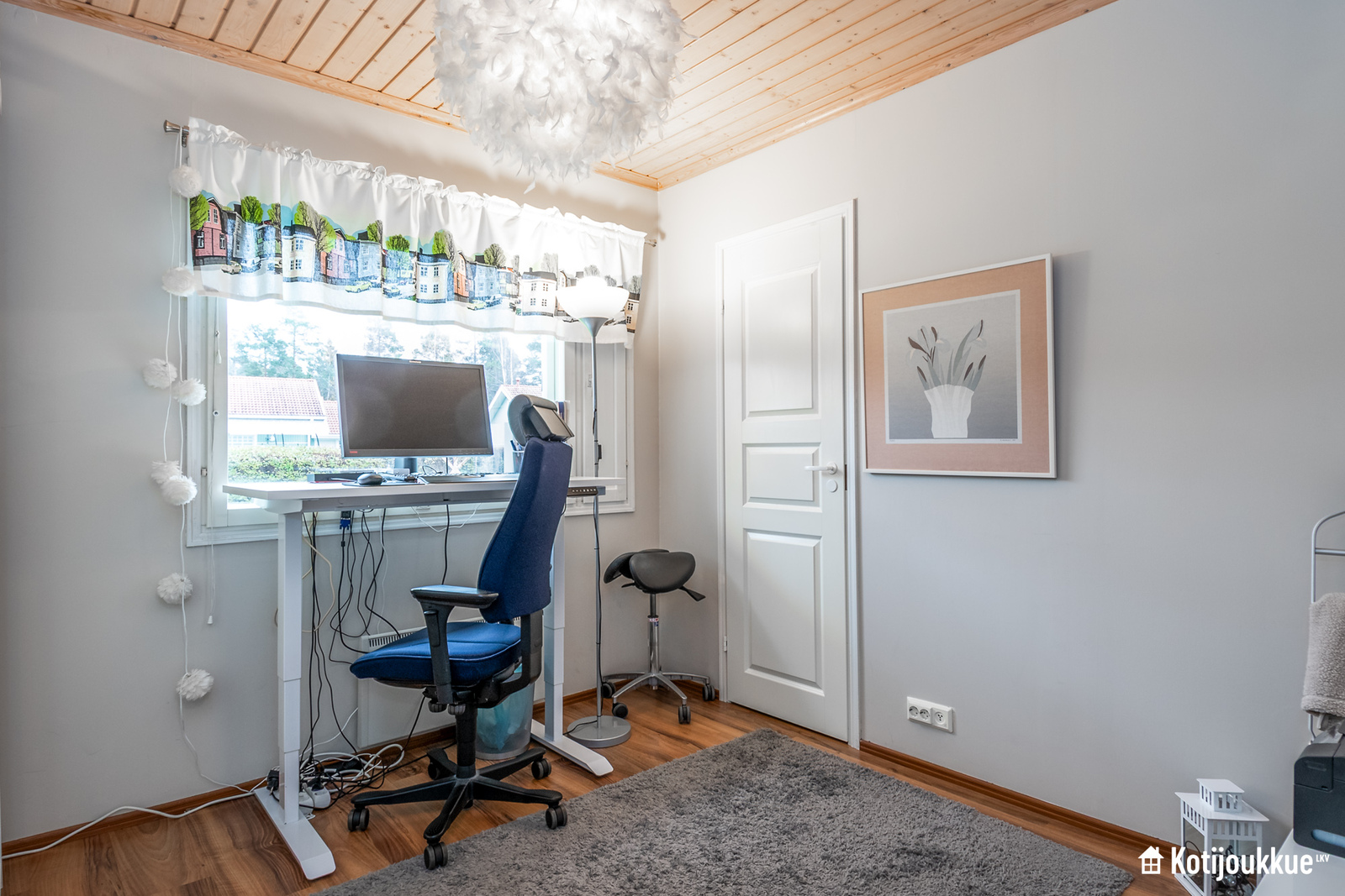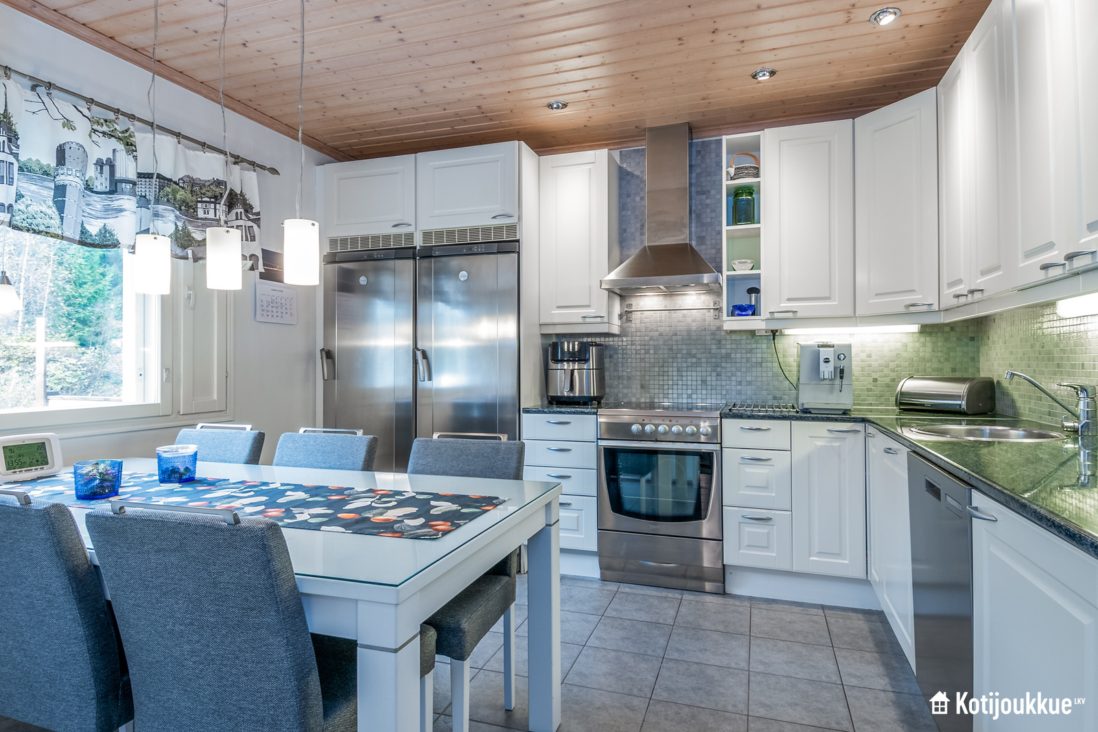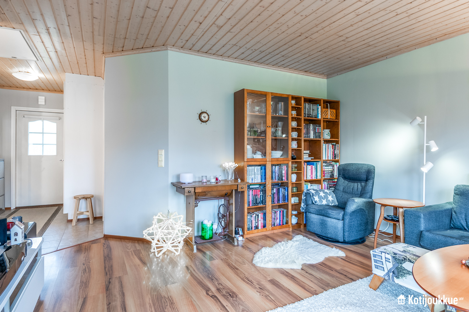 Koti on harmoninen ja kaunis kokonaisuus, jonka selkeä pohjaratkaistu antaa avaimet toimivaan arkeen. Heti sisäänkäynnin yhteydessä on avara keittiö, jossa runsaasti säilytystilaa ja tilaa ruokapöydälle. Tilava olohuone antaa sisustajalle paljon vaihtoehtoja sekä on kuin luotu perheen yhteiseen ajanviettoon. Olohuoneesta on myös kulku takapihan terassille, joka jatkaakin oleskelutiloja luontevasti kesäkaudella. Paritalomuodostelman ansiosta takapiha jatkuu talon päädylle saakka ja tilaa riittää, vaikka pienelle hyötypuutarhalle.