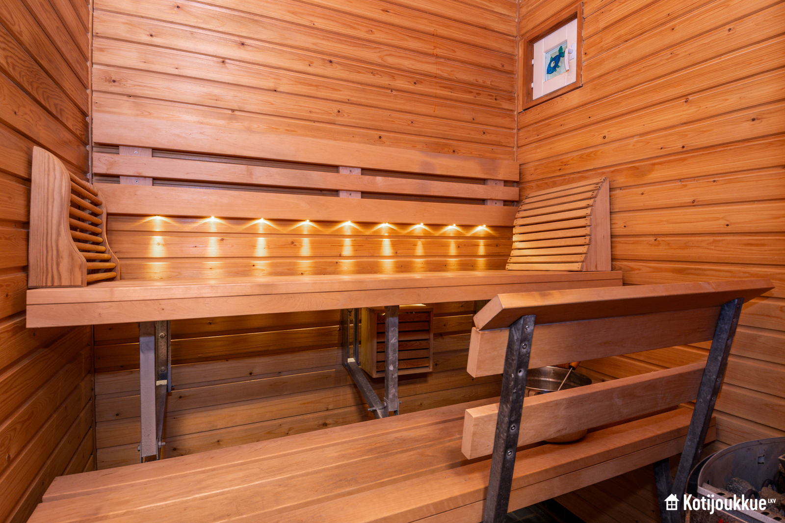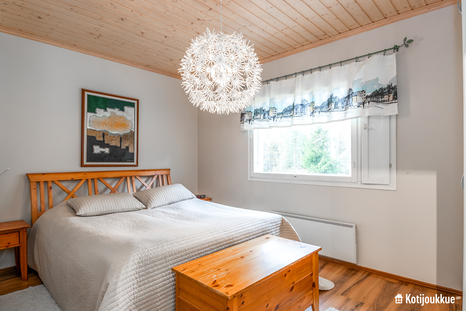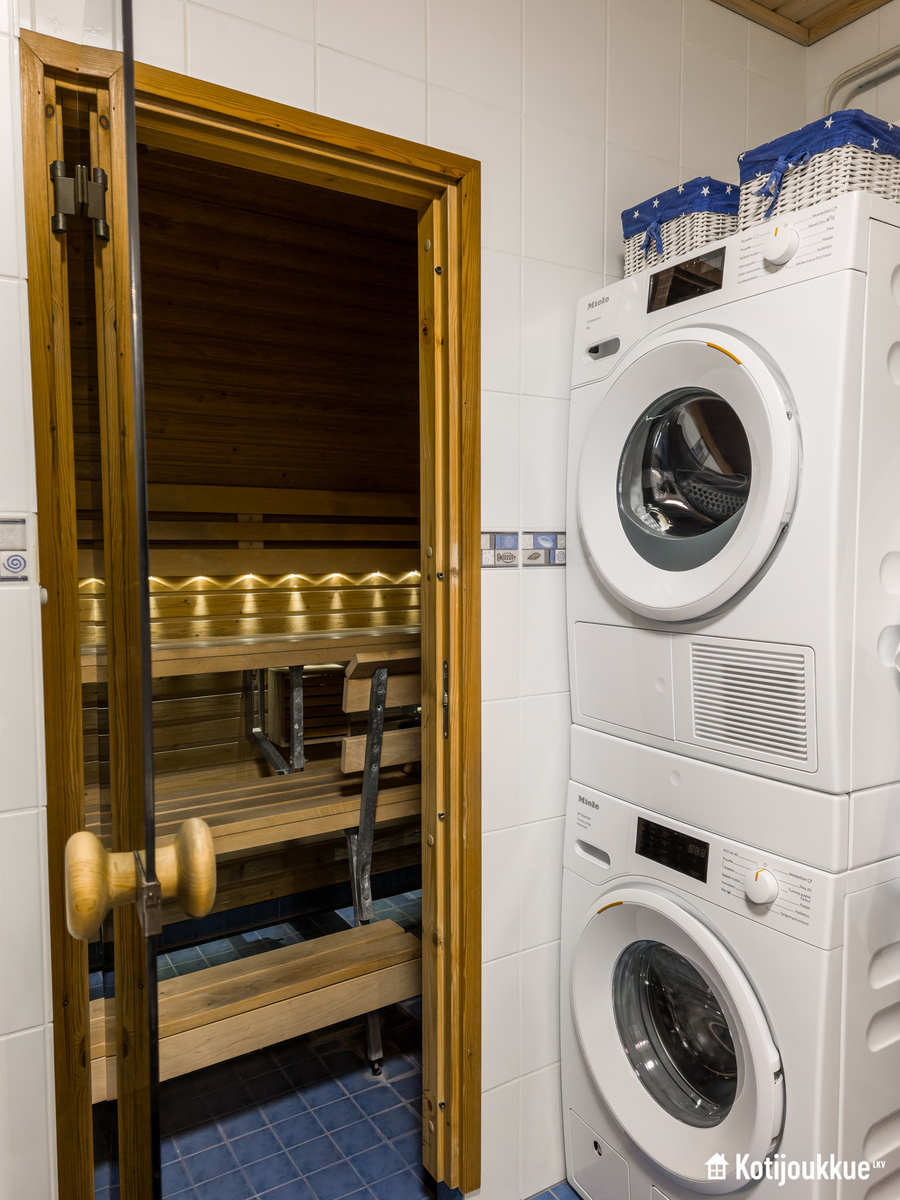 Molemmissa makuuhuoneissa on loistavasti säilytystilaa ja kokonaisuuden kruunaa hyvät kodinhoitotilat saunaosaston yhteydessä.