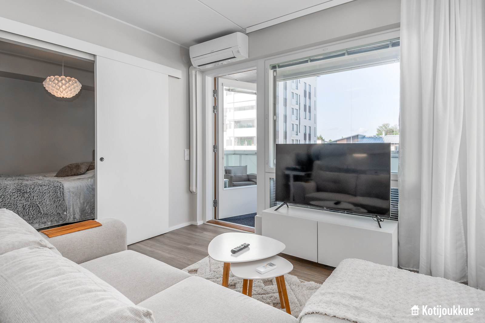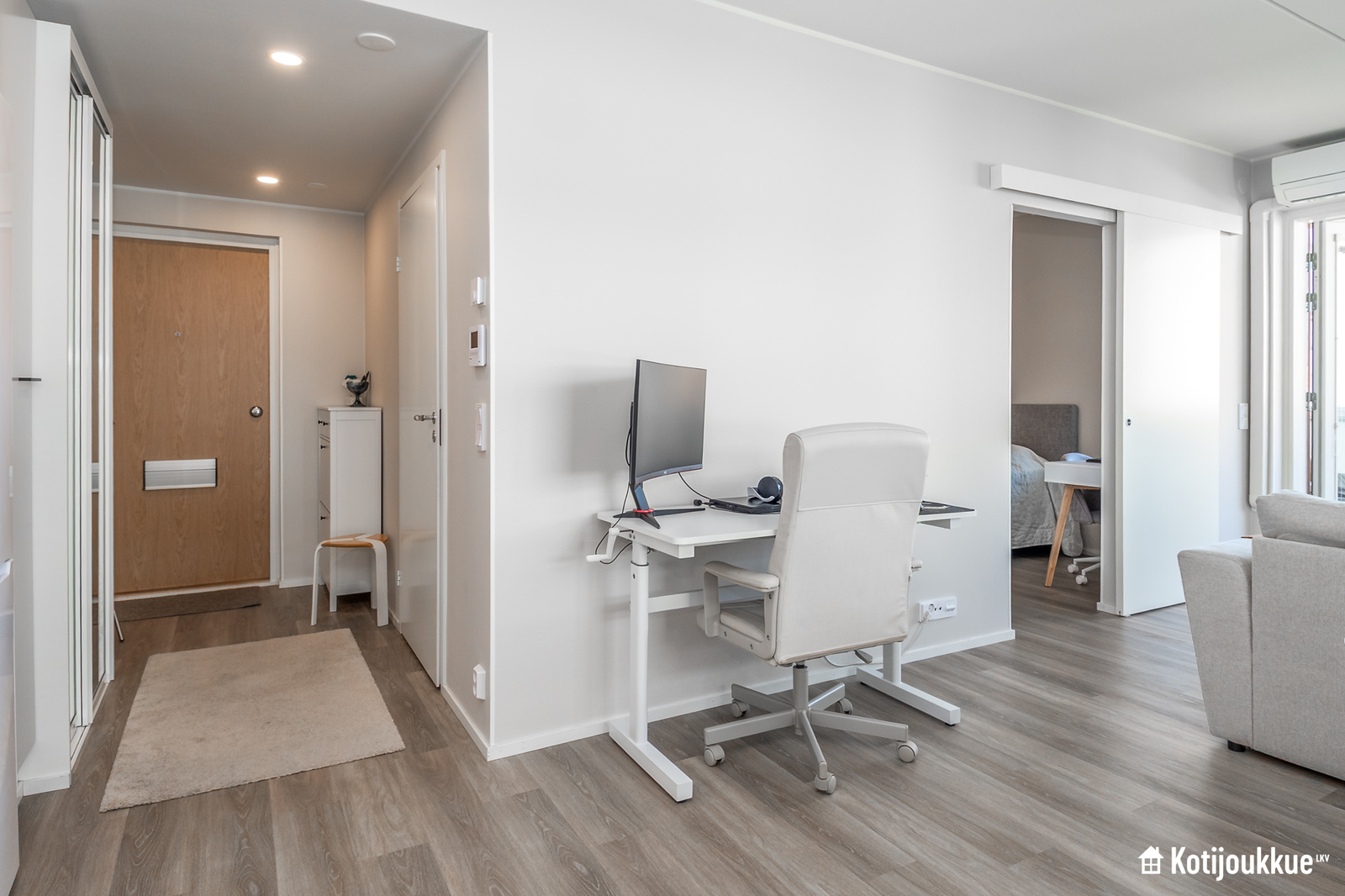 Huoneistossa on miellyttävä vesikiertoinen lattialämmitys, ja kesähelteillä asumismukavuutta lisää ilmalämpöpumppu. Energiatehokkuusluokka A kertoo hyvin suunnitellusta kokonaisuudesta.