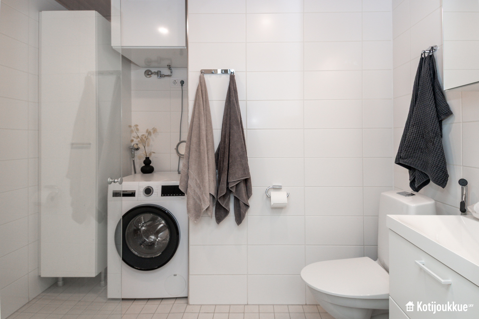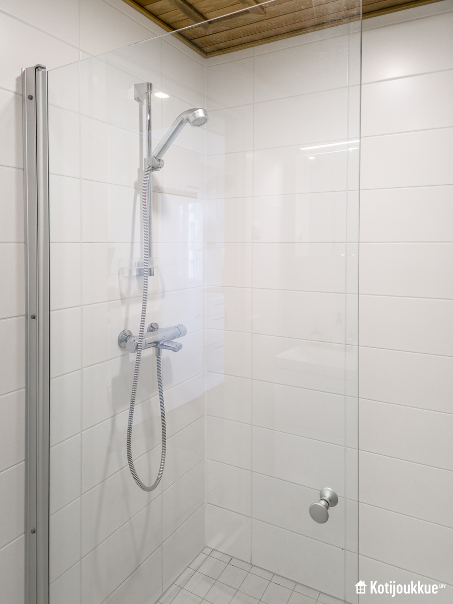 suihkuseinä, pesukoneliitäntä, lattialämmitys, wc-istuin, suihku, peili, kylpyhuonekaapisto
