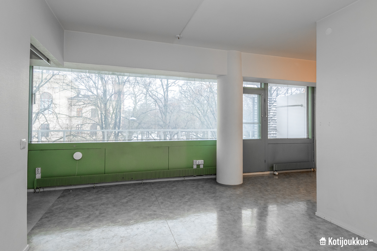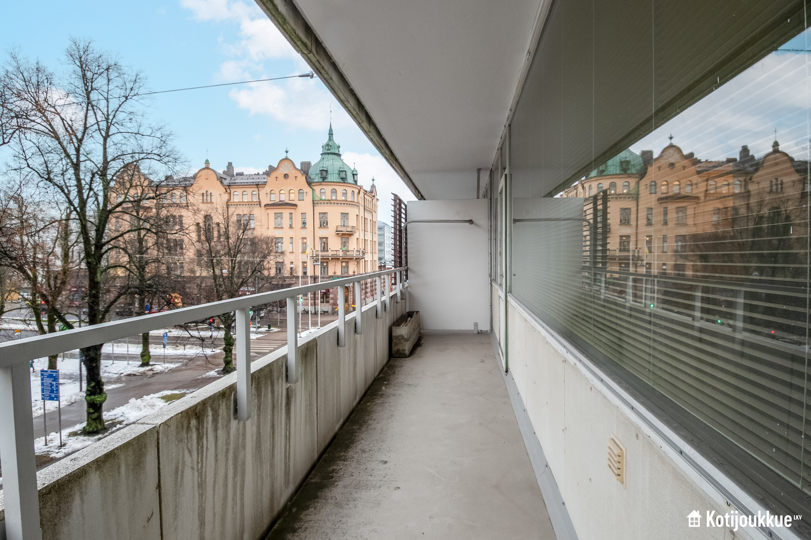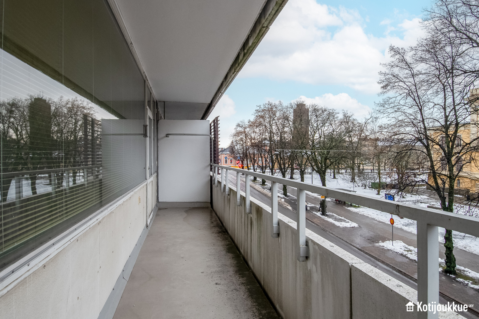 Toimiva keittiö jatkuu olohuoneeseen ja tilaa on isommallekin ruokapöydälle keittiön edustalla. Suurien ikkunoiden edessä olevaan olohuoneeseen saa mukavasti sommiteltua sohvat ja oleskelutilat. Tilava makuuhuone ja erillinen vaatehuone toimivat monenlaiselle asukkaalle. Kokonaisuuden kruunaa huoneiston levyinen parveke, jonka vehreiden kaupunkimaisemien äärellä viihtyy pitkälle syksyyn.