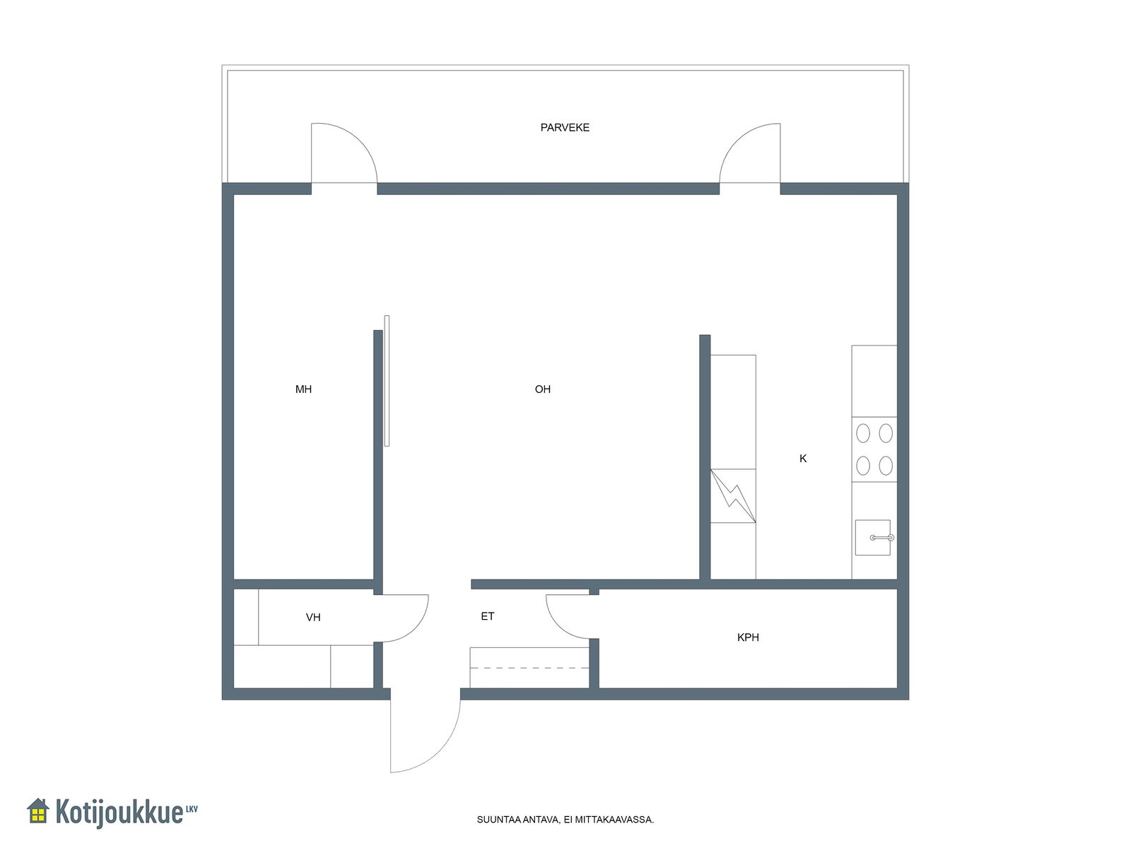 Tässä valoisassa ja hyvällä pohjaratkaisulla varustetussa kaksiossa on mukavan väljät neliöt pariskunnan tarpeisiin.