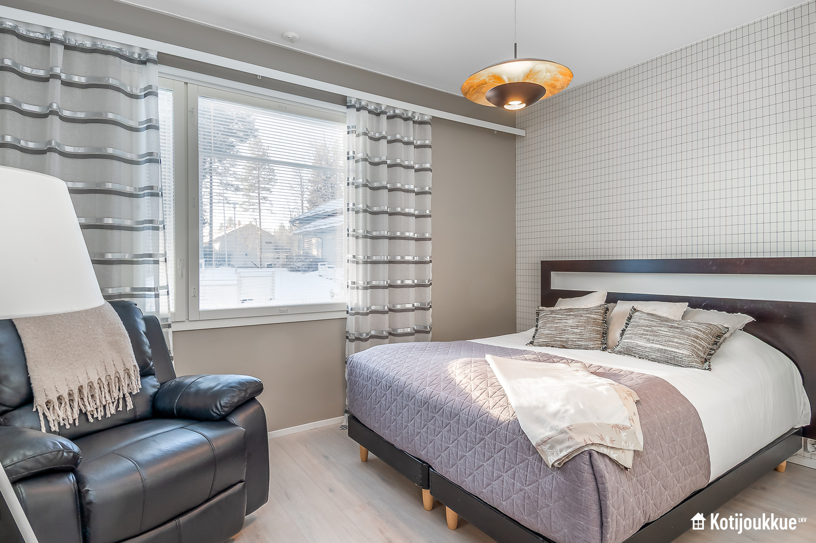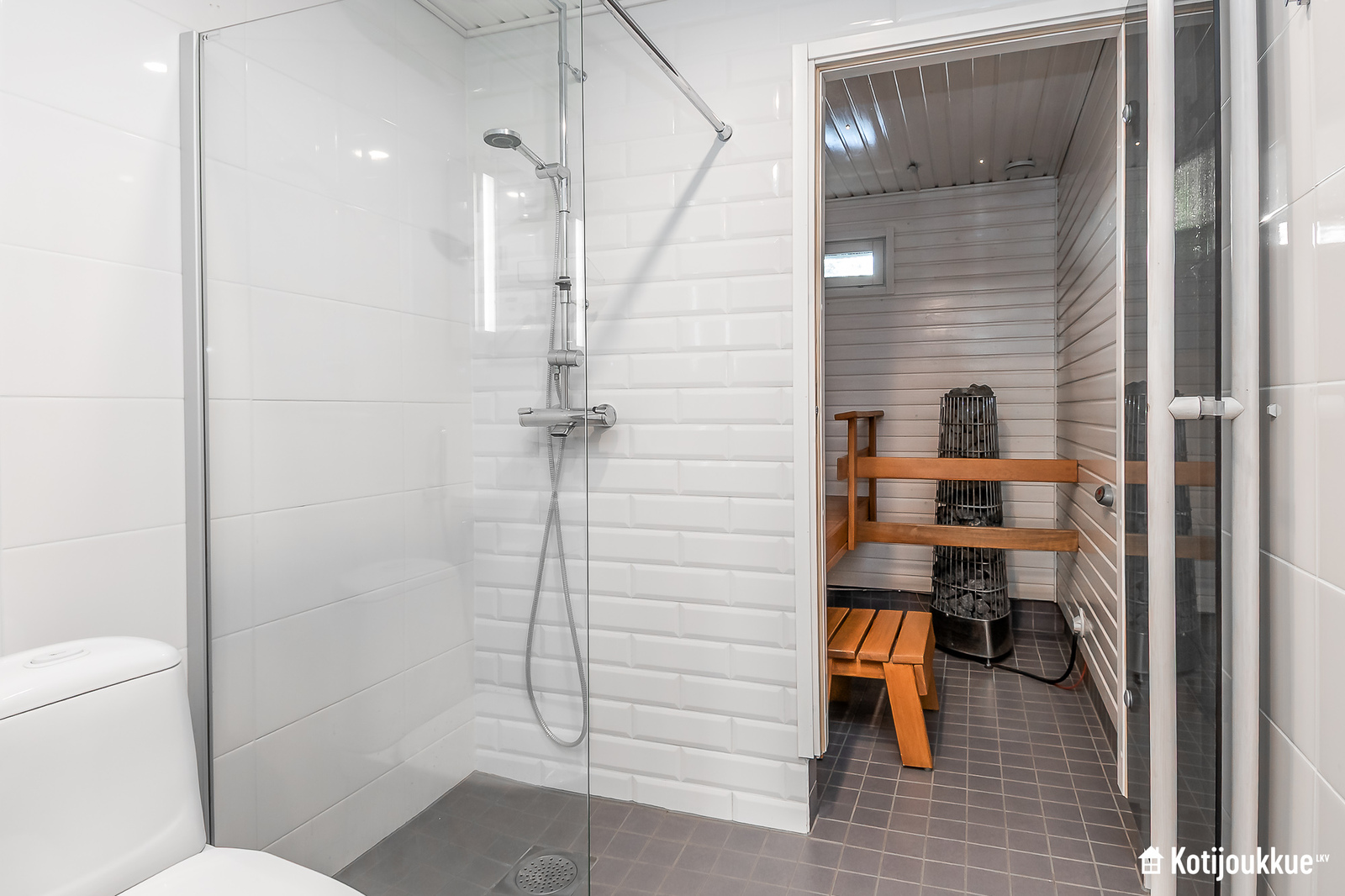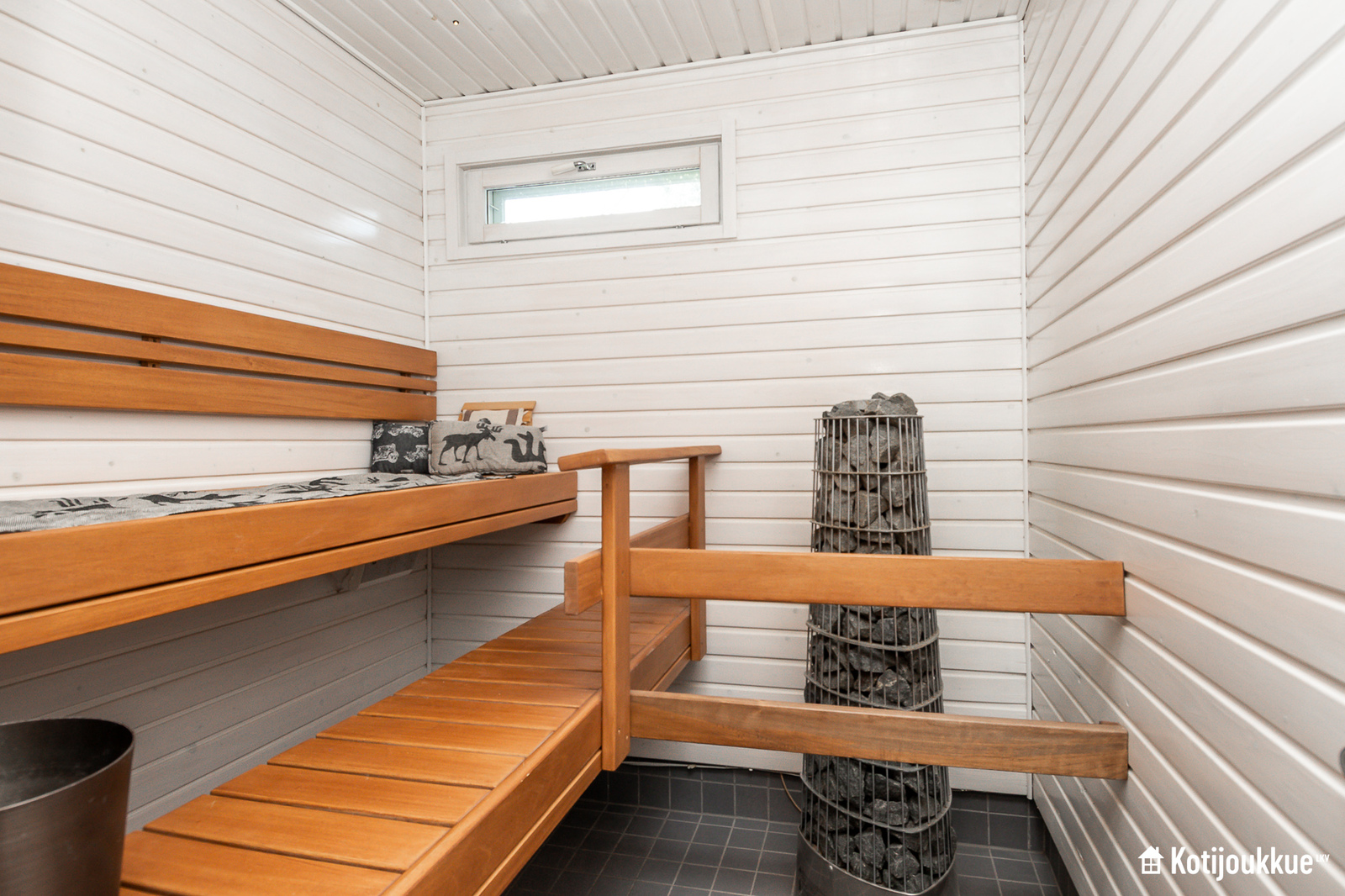 Kodista löytyy kolme eri kokoista makuuhuonetta, jotka soveltuvat hyvin eri elämäntilanteisiin. Yhdestä makuuhuoneesta on suora käynti takapihan terassille, josta pääsee kulkemaan talon ympäri. Myös varastotilan riittävyydestä on huolehdittu makuuhuoneiden tilavilla kaapistoilla, sekä sisäänkäynnin yhteydessä olevalla tilavalla lämpimällä ulkovarastolla ja erillisellä häkkivarastolla. Kylpy- ja saunaosaston katseenvangitsijana on ajattoman kauniit kaluste- ja laattavalinnat sekä näyttävät lasipinnat. Erillinen toinen wc lisää arjen toimivuutta.