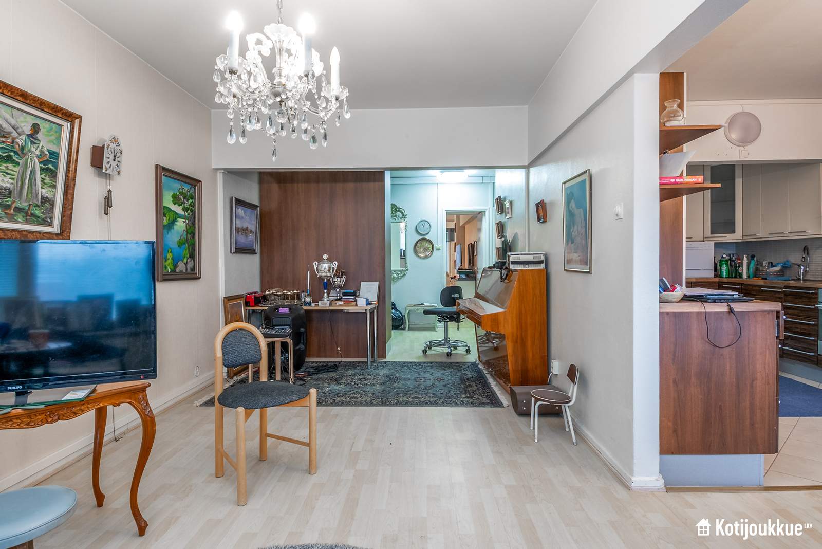 Suuri olohuone, jonka avaruuden tunnetta korostaa suora yhteys keittiöön.