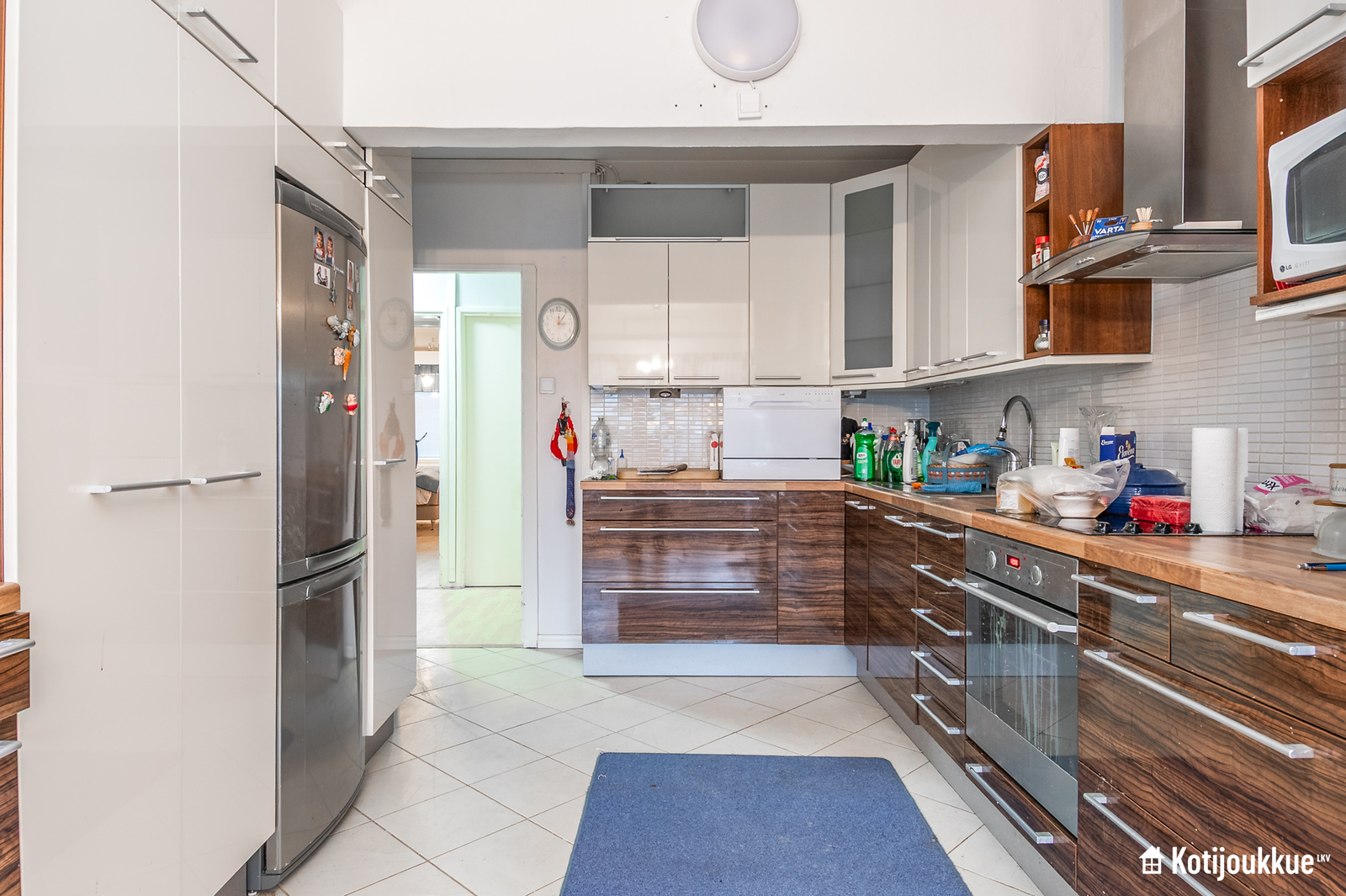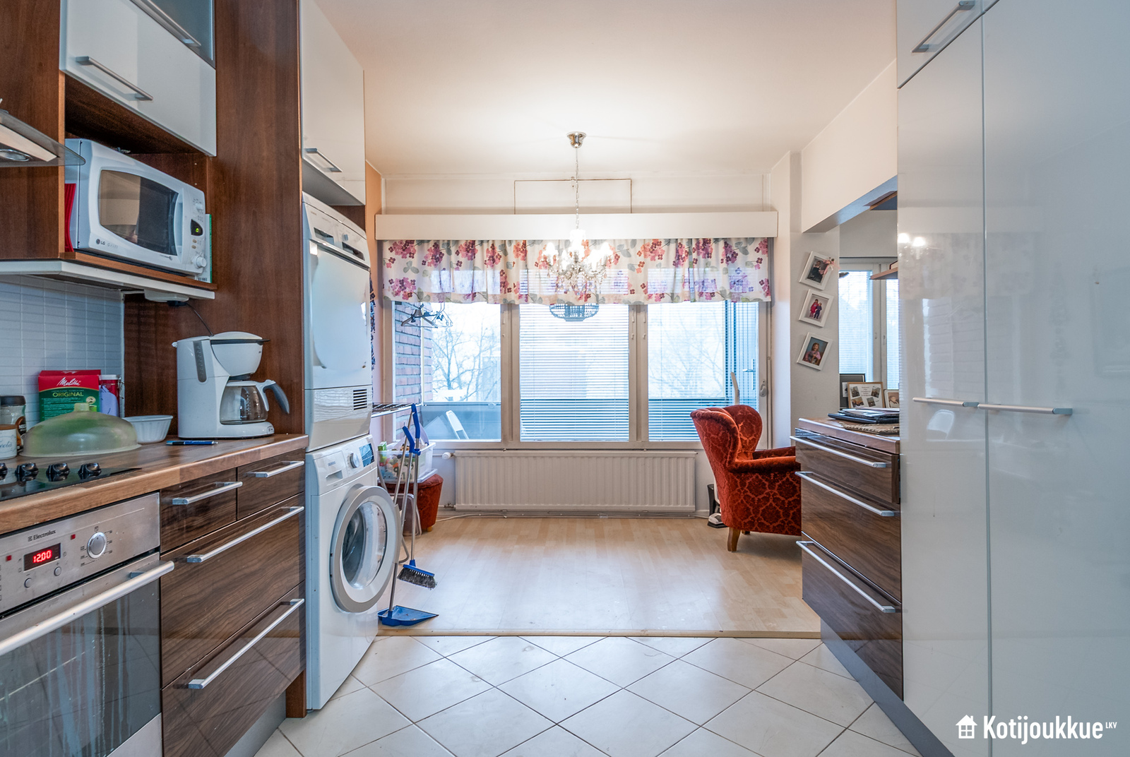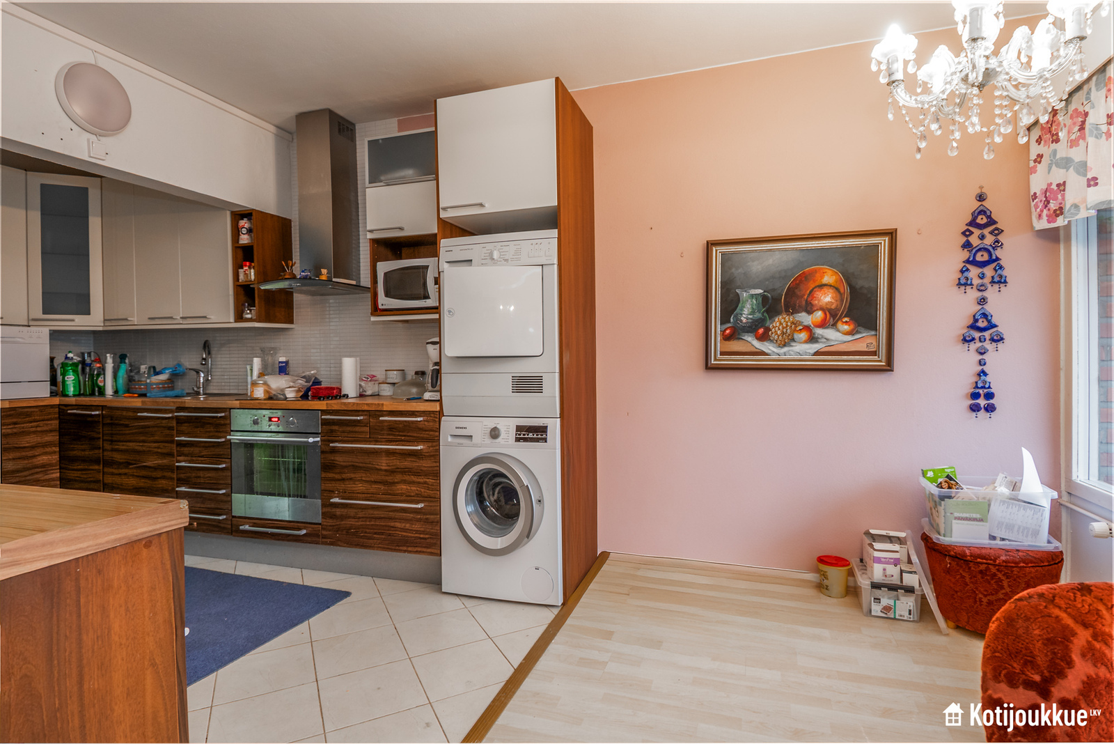 Siisti keittiö, josta löytyy pesutorni, ja keittiöstä on kulku parvekkeelle.
